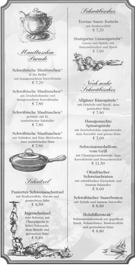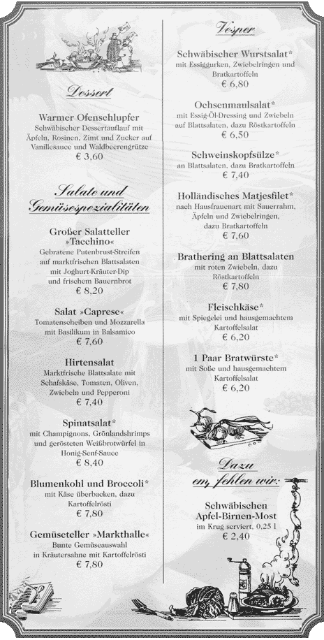 Getränke Württemberger/Badener Wein Stettener Heuchelberg Riesling QbA 0,25 l - Euro 3,40 Auggener Schäf Gutedel QbA trocken 0,25 l - Euro 3,40 Uhlbacher Weinsteige Trollinger QbA trocken 0,25 l - Euro 3,40 Haberschlachter Heuchelberg Trollinger mit Lemberger QbA trocken 0,25 l - Euro 3,40 Lauffener Katzenbeißer Schwarzriesling QbA 0,25 l - Euro 3,40 Brackenheimer Heuchelberg Scharzriesling Weißherbst QbA 0,25 l - Euro 3,60 Weinschorle von o.g. Qualitätswein 0,25 l - Euro 2,40 Schwäbischer Apfel-Birnen-Most im Krug serviert 0,25 l - Euro 2,40 Sekt & Spumante Piccolo Hausmarke 0,2 l - Euro 4,20 Prosecco Valdobbiadene 0,1 l - Euro 4,20